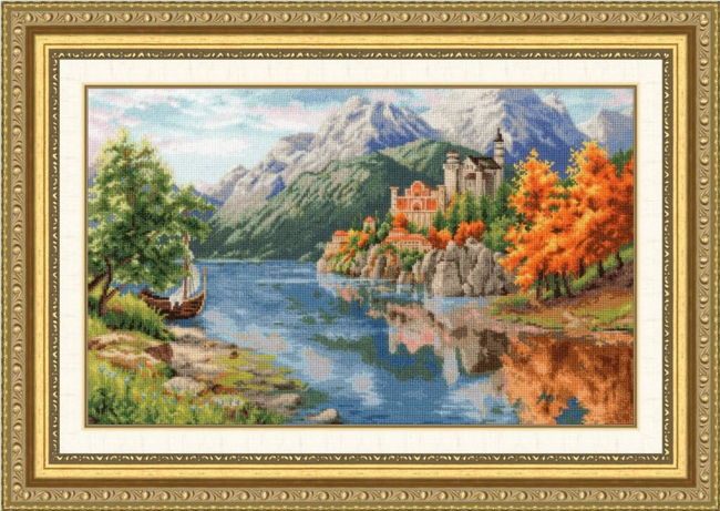 Как же прекрасен замок в окружении могучих гор! Они дополняют его образ, придавая ещё большее величие и неприступность. Устье фьорда, пышные деревья и торговый парусник, создают необычный пейзаж, наполняющий картину яркими красками и душевным спокойствием. Так и хочется попасть в этот тихий мир, изолированный от городской суеты и шума машин.Россия: